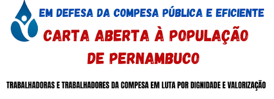 Notícias COMPESA: CARTA ABERTA À POPULAÇÃO DE PERNAMBUCO 14 de outubro de 2025 O Sindicato dos Urbanitários de Pernambuco e os representantes dos trabalhadores da COMPESA vem informar à população que a categoria...